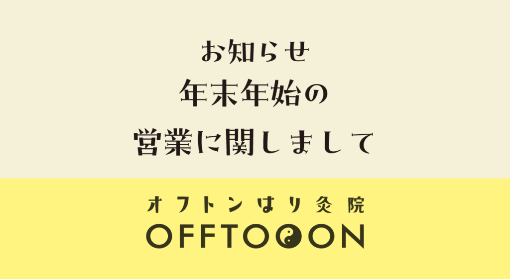 平素は格別のお引き立てをいただき厚くお礼申し上げます。オフトンはり灸院では、年末年始に伴い下記の期間を休業とさせていただきます。 [年末年始の休み]2025年12月29日(月)~ 2025年1月2日(金)最終営業日は、12月28日(日)となります年始は2025... -